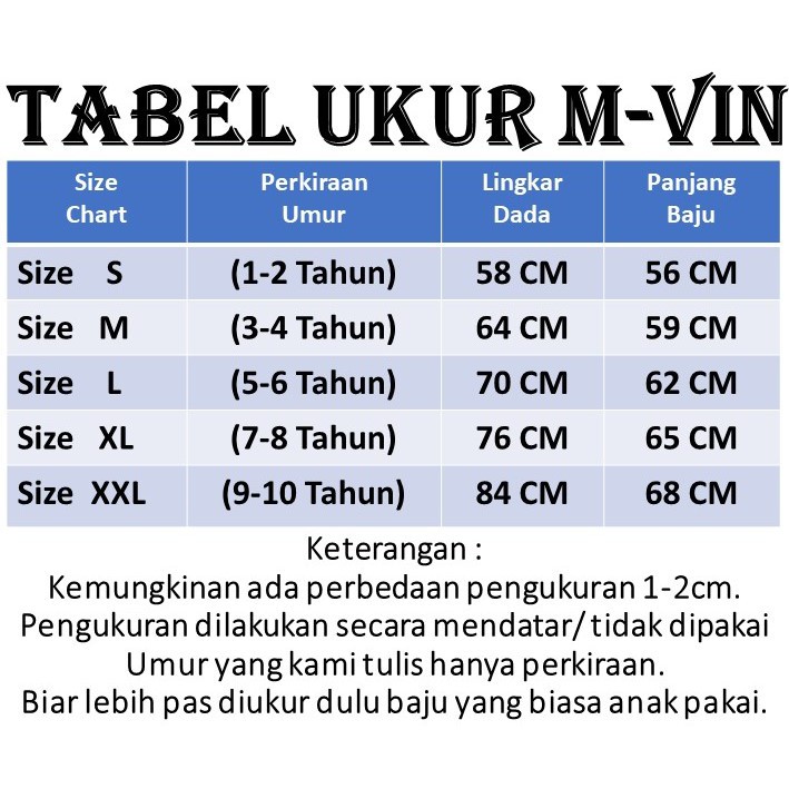 Cari harga dan promo terbaik untuk size chart baju anak diantara 6 produk.